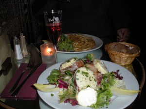 Kir Royals made with real champagne, followed by a salad with mini toasts and warm goat cheese. I highly recommend it!