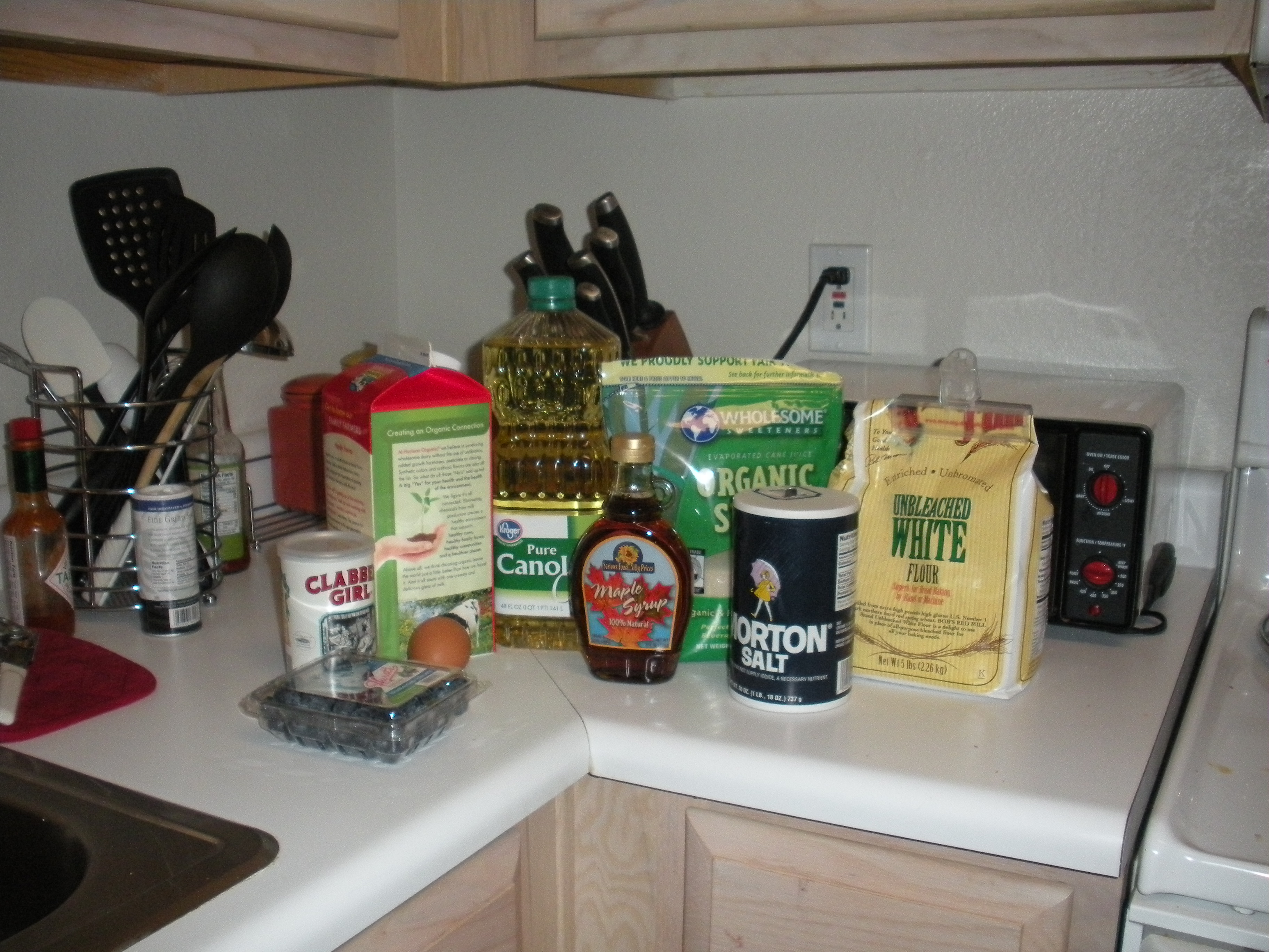 For 2 servings, the ingredients are pretty simple: 1 egg, 1 cup of milk, 2 tablespoons of canola oil, 1 tablespoon of sugar, 1 1/4 cups of flour, 1/2 teaspoon of salt, 3 teaspoons of baking powder, and 1/4 cup on blueberries.