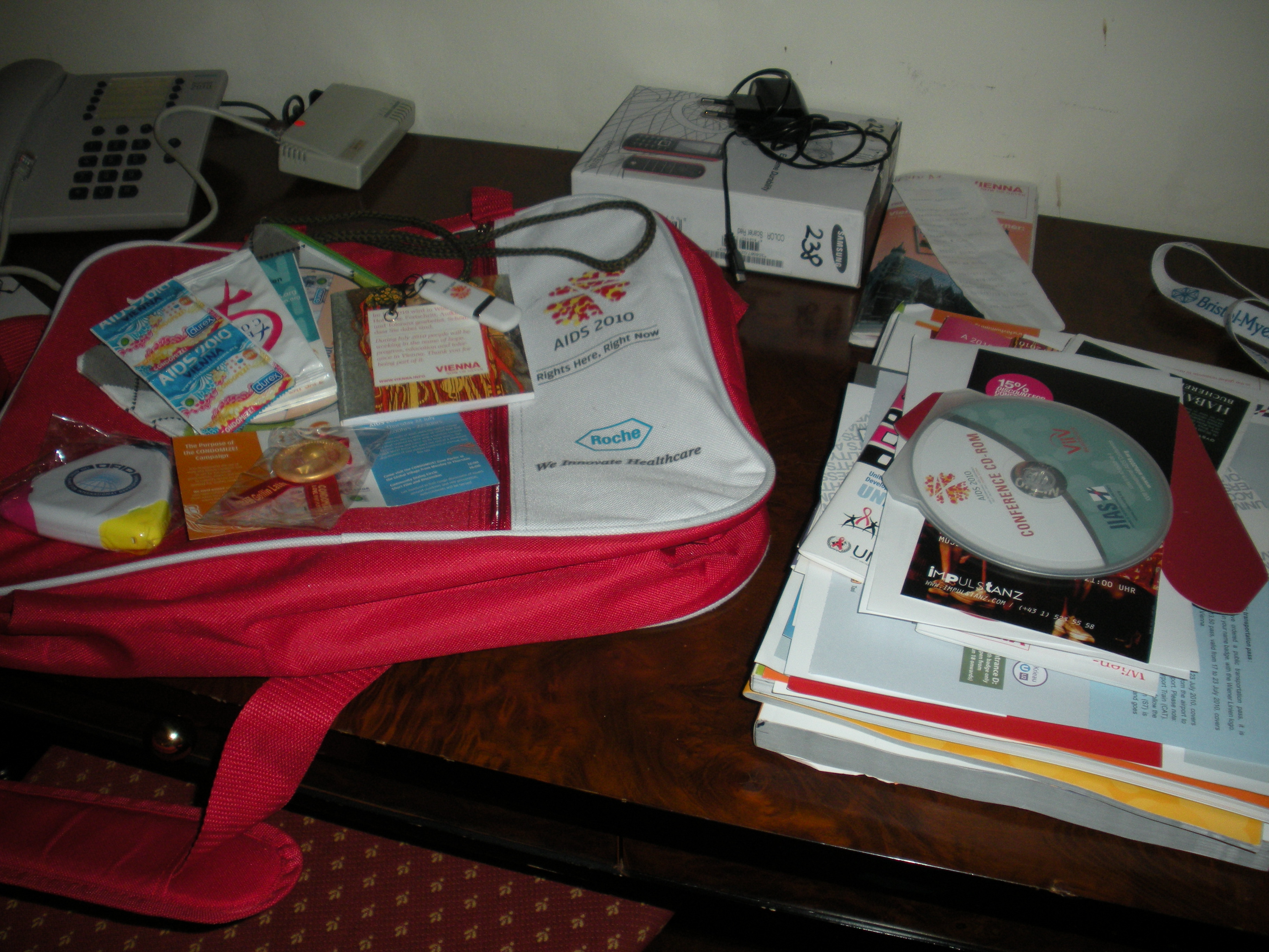 Later, I went down to the Messe Prater Conference Centre to register for the conference. Upon checking in, one gets a conference bag filled with about a tree’s worth of paper materials and a few cool things. When I got back to the hotel, I divided my loot into piles of things to toss and things to keep. Fortunately, this year they had a recycle bin. The few cool things included a flash drive, highlighter/tri-lighter, small purse, condom pin, and the official conference free condoms. Too bad I didn’t bother to save the official condoms of the last International AIDS Conferences I attended in Mexico City and Toronto, as each year there is a new design and I could have quite a collection by now.