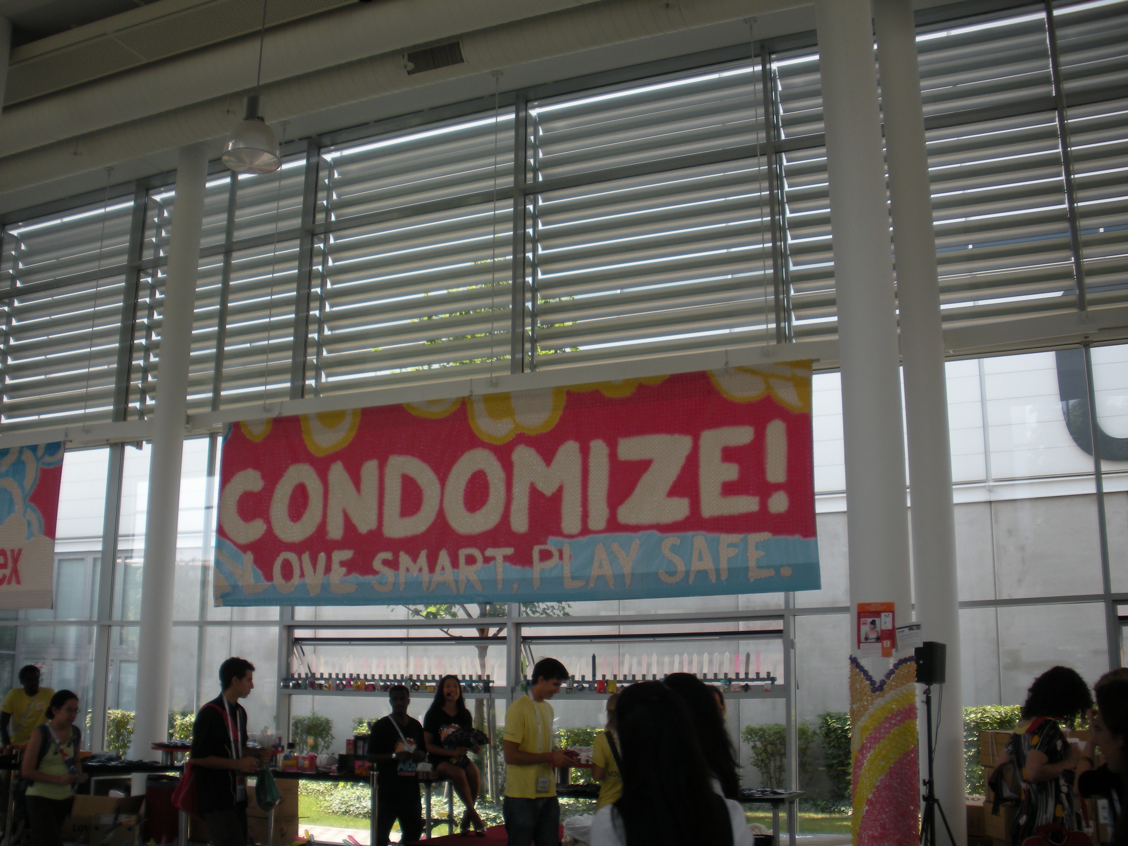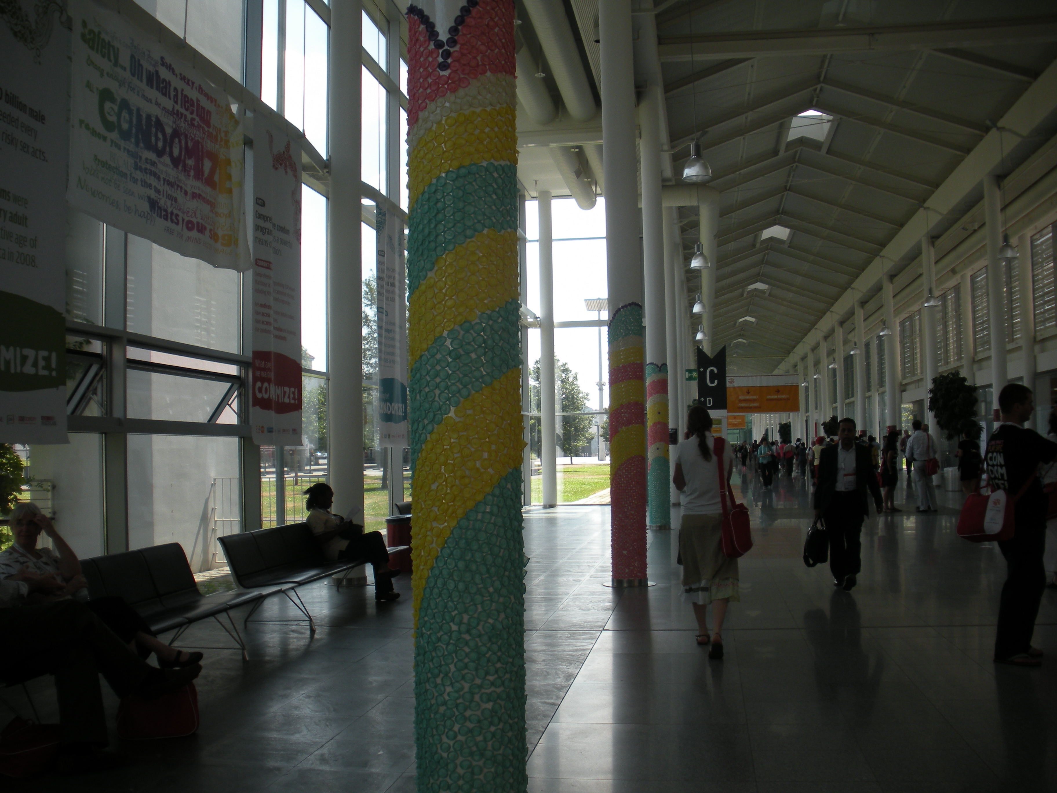 The UNFPA-supported Condomize campaign had a large presence in both the Global Village and the hallway of the main conference venue. At the conference, they had the goal to distribute 1 million condoms. Now, I must vent on a little pet peeve of mine. While condoms are distributed in abundance at this conference – I probably had over a dozen handed to me while not seeking them on my own – people at risk for HIV in low-income countries have limited access to them. When I was in Uganda in 2008, I believe the figure was 3 condoms per adult male per year. I am not opposed to condom distribution at conferences, but I do have a problem when thousands of condoms are wasted on decorations such as these: