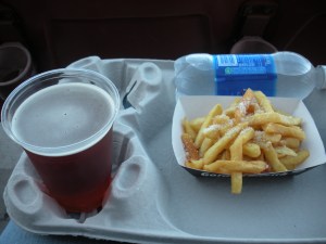 Now for the part of the evening where all our money went – concessions. It would have been better to have eaten at home before the game or gone to happy hour at the 777 Restaurant and Brewery at Main Street Station for $2 pints of microbrews and generous $4.50 appetizers. At the game, dinner was a 12-oz. cup of Gordon Biersch Marzen microbrew, garlic fries, and a bottle of water. The beer was good (not worth the $6 though), but my garlic fries had zero garlic on them. The white stuff you’re seeing in the photo below is parmesan cheese. A mean trick for this garlic lover! I was so sad that I had to console myself after the second inning with Ben & Jerry’s ice cream. But as my husband and I noted, after his third alcoholic beverage of the night, what else are you going to do at a baseball game besides eat and drink?