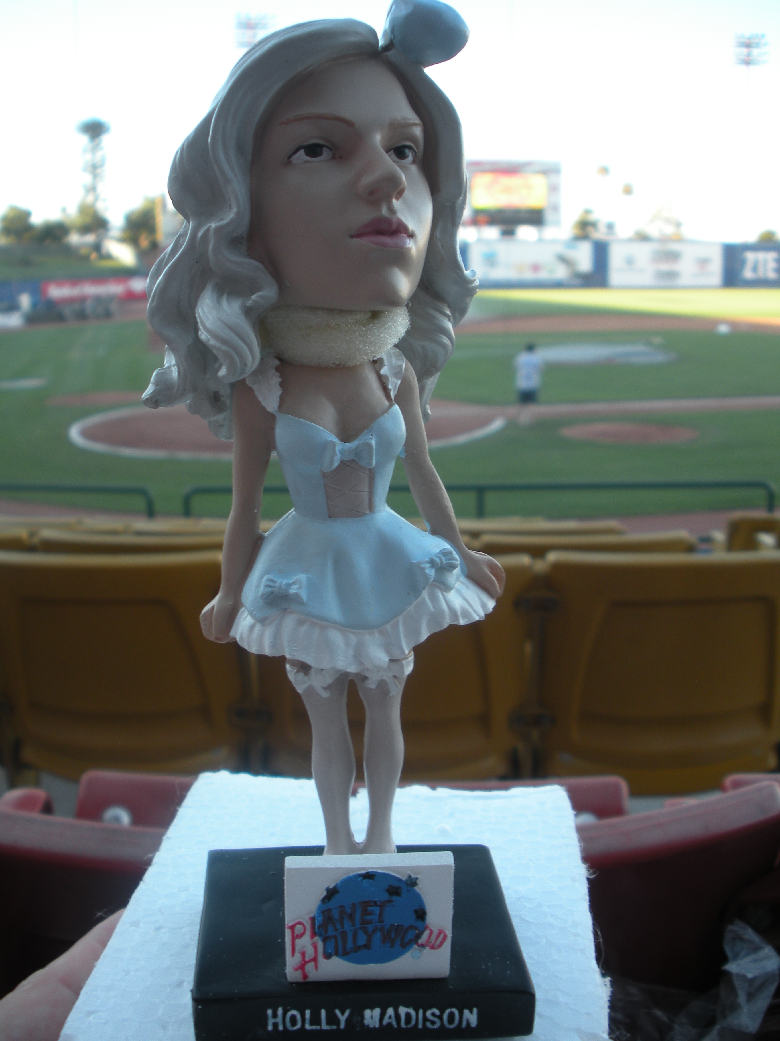 Like many sporting franchises, the Las Vegas 51s offer various promotions throughout the season. Monday is dollar menu night, Tuesday is bobblehead night, Thursday is dollar beer night, and occasionally they have fireworks on the weekends. This year, the bobbleheads featured local entertainers – Rita Rudner, Gordie Brown, Carrot Top. Several years ago bobbleheads of our famous mayor, Oscar Goodman, were given away, featuring him dressed as Uncle Sam, in a baseball uniform, and in a business suit. Those who know me well know that I am not into “stuff,” but somehow I was intrigued by this year’s Holly Madison bobblehead night, featuring her in a Peepshow outfit.
