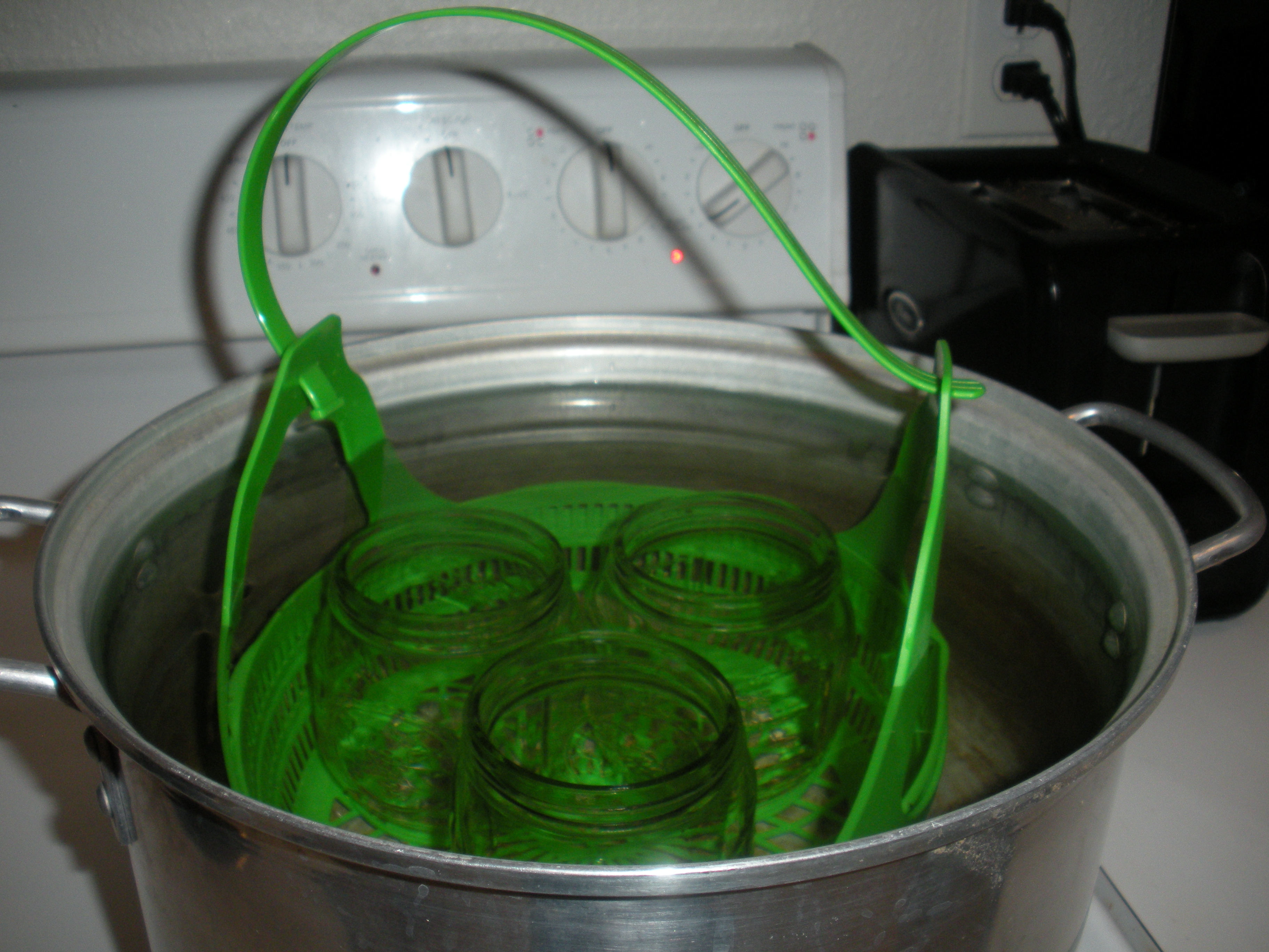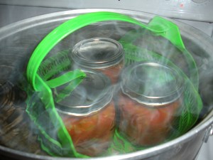 To begin canning, you’ll need the following equipment – a large stockpot that is at least 7 1/2 inches tall and 9 1/2 inces in diameter, a plastic or metal canning rack that will fit in your stockpot and prevent the jars from rattling, and 3 pint size glass jars with metal rings and unused lids. Other useful tools especially for canning include a pair of tongs, a special magnet contraption to help remove the metal lids from boiling water, a funnel that conforms to the mouths of your jars, and a small non-metallic spatula. I bought my equipment in 2 separate starter kits at my local grocery store.