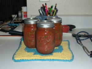 Lately I have been looking forward to Sundays, as it’s the day of the week that I normally tackle a new project around home. Today I tried my hand at canning homemade salsa. The recipe I used below makes 3 pints and is adapted from Ball Beginner’s Guide to Canning & Recipe Booklet. I’ve modified the recipe a bit to give it a little spicy kick, and I ended up with about 1 cup extra salsa to have with dinner. If you’re not interested in canning, and plan to eat all the salsa within the next week or two, you can cut the recipe in half or one-third and ignore steps 1, 3 and 4.