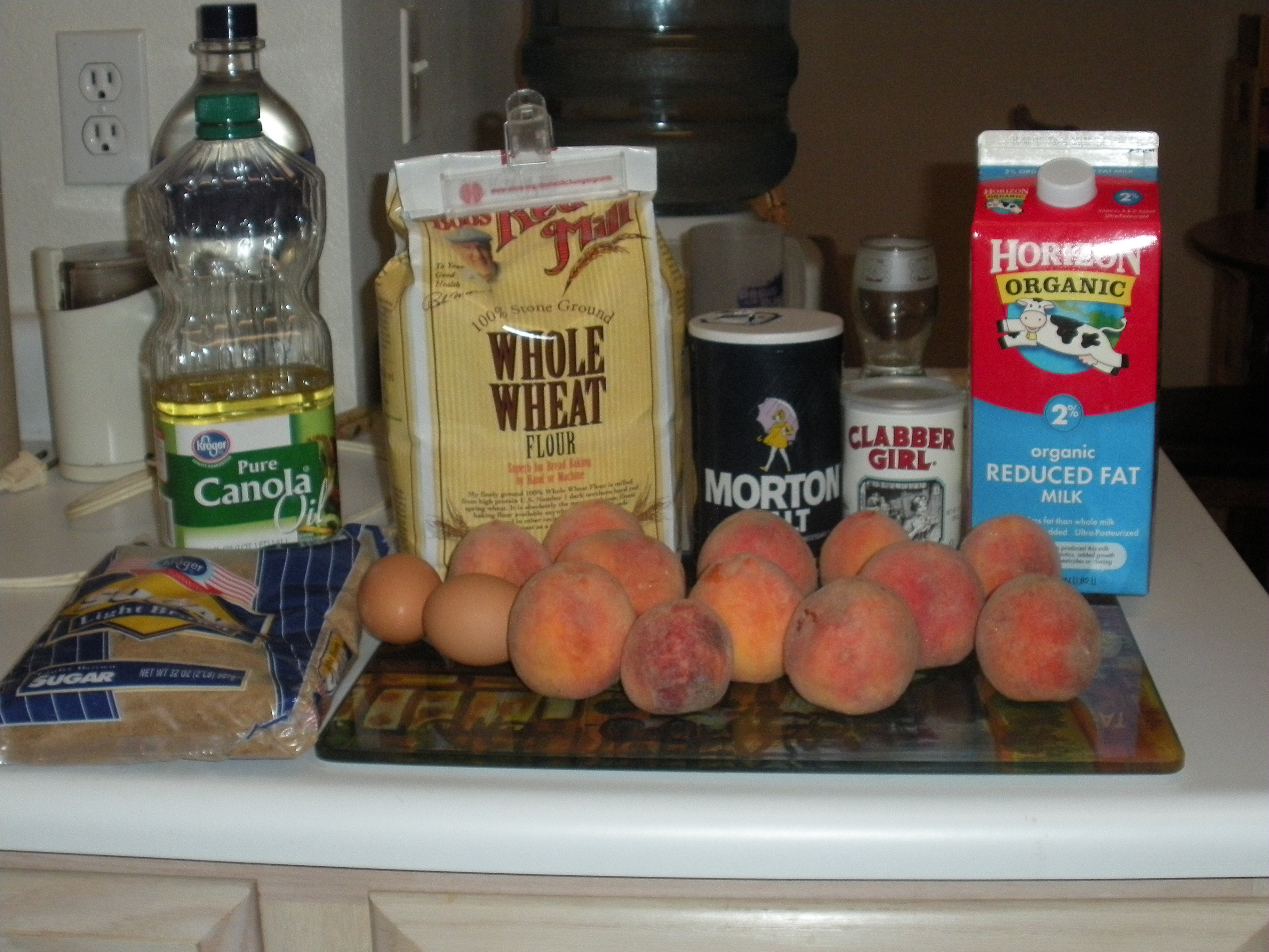 For ingredients, you’ll need 4 cups of chopped, peeled & pitted peaches, 4 1/2 cups of whole wheat flour, 1 tablespoon baking powder, a pinch of salt, 2/3 cup packed brown sugar, 2 eggs, 1/2 cups canola oil, and 1 cup of milk.
