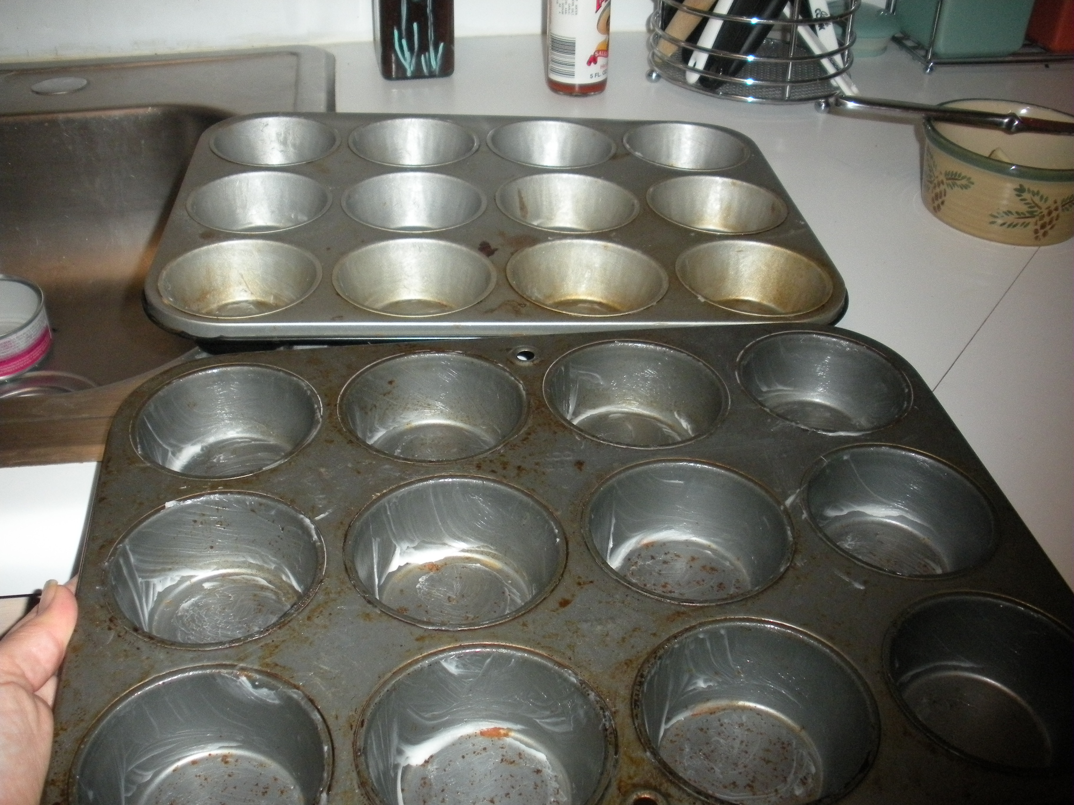 Preheat the oven to 350 degrees Fahrenheit. Grease two 12-cup muffin tins with Crisco.