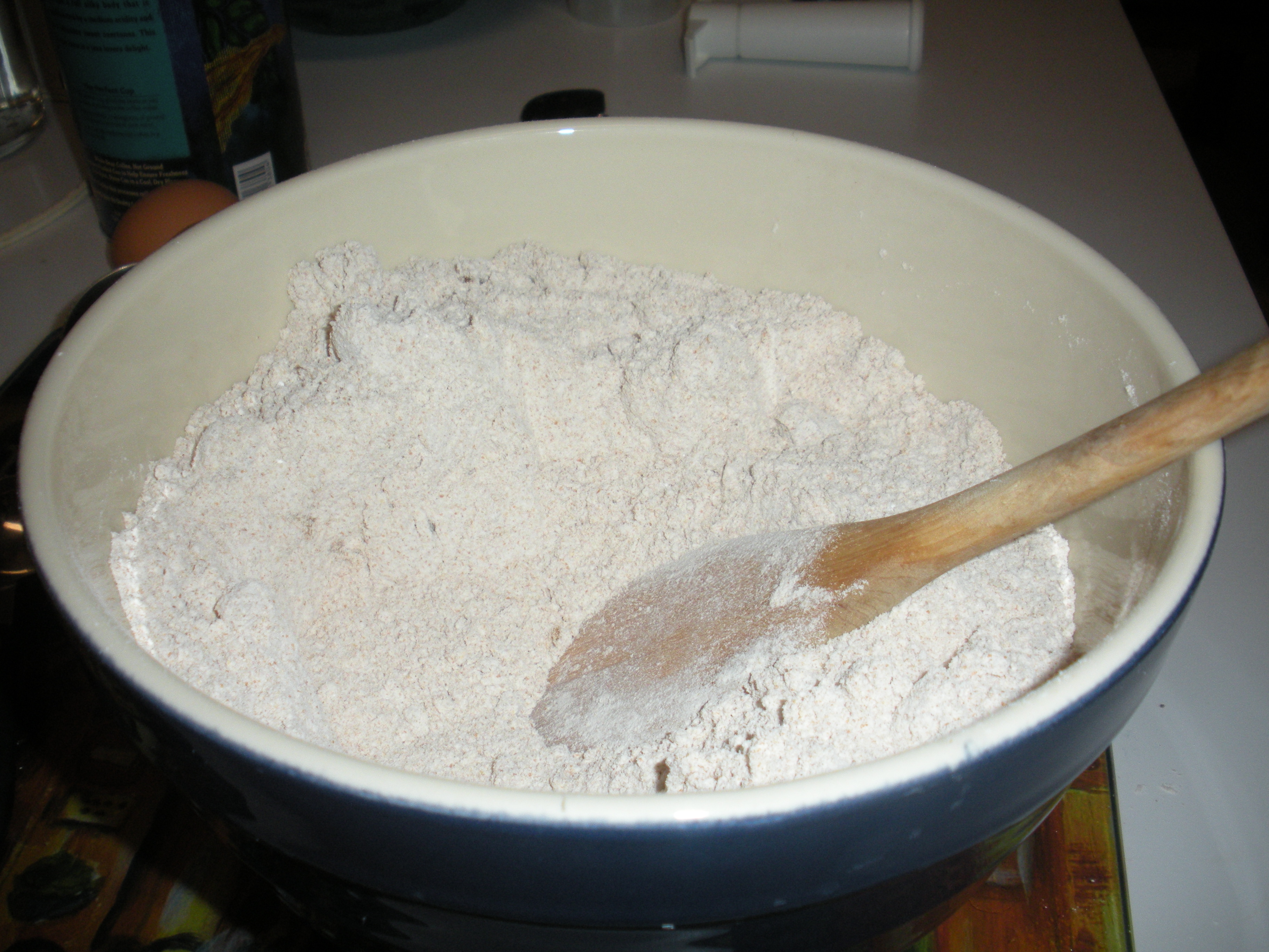 In a medium bowl, combine the flour, baking powder, salt and sugar with a spoon.
