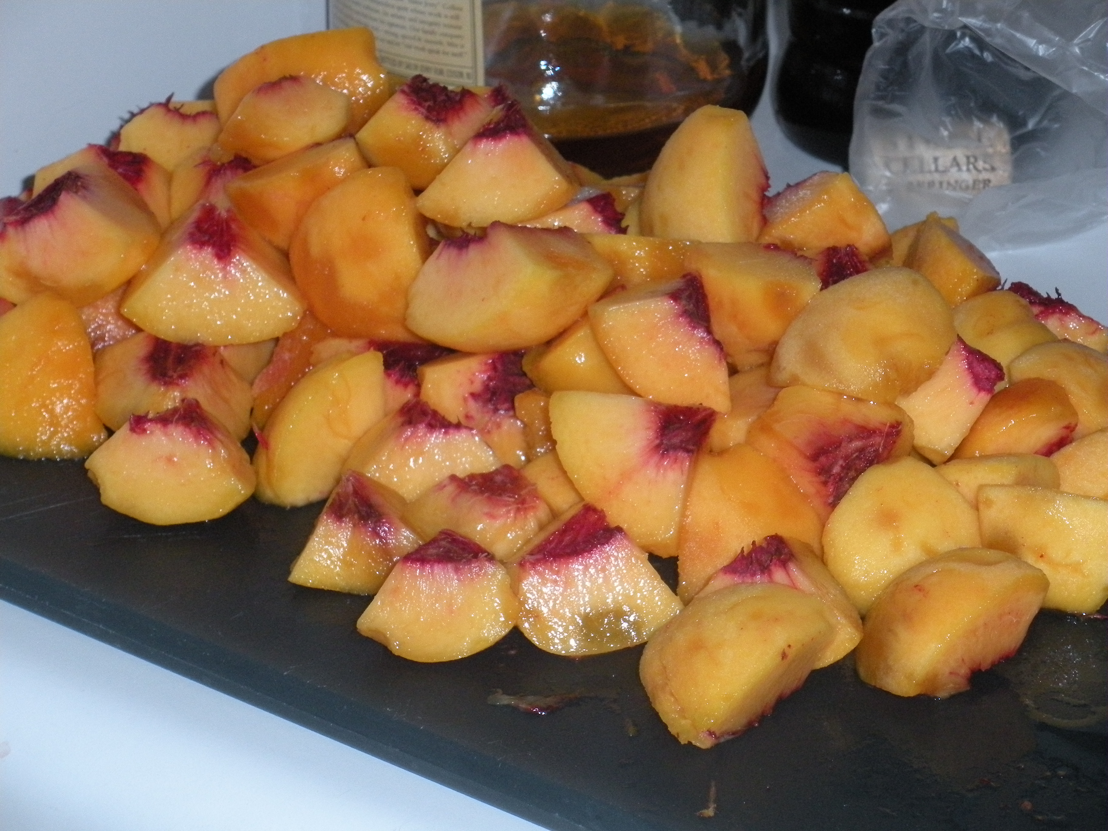 Last Thursday I wrote about the 2 dozen+ fresh peaches my cousin gave me and the peach-whole wheat muffins I made from a handful of them. While my muffins were baking in the oven, I began another peach-fest project: peach-infused vodka.