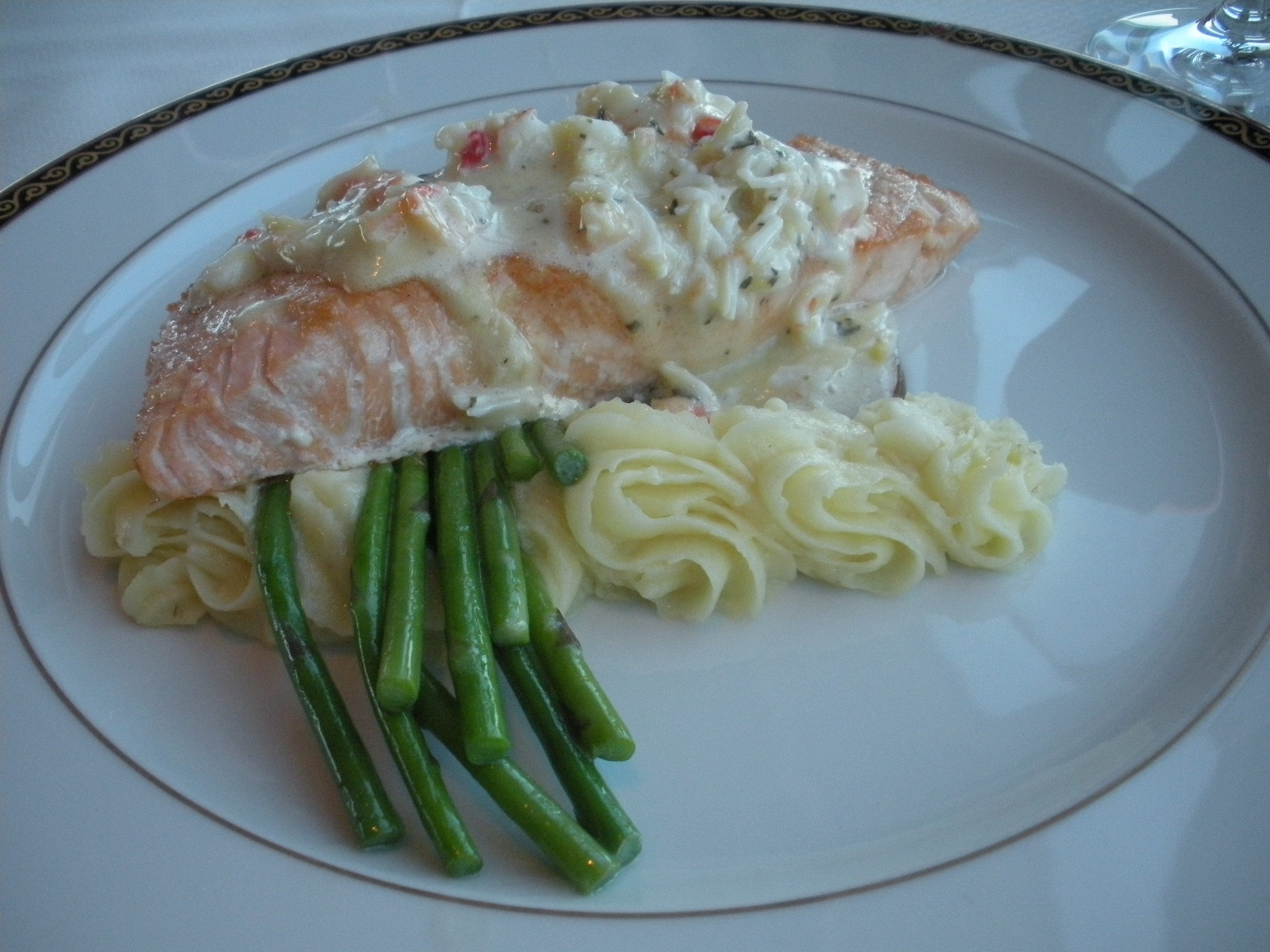 My entreé was a slow-roasted salmon served with a King Crab Bérnaise sauce. For accompaniments, it was served alongside some mighty tasty mashed potatoes with a hint of horseradish and pencil asparagus.