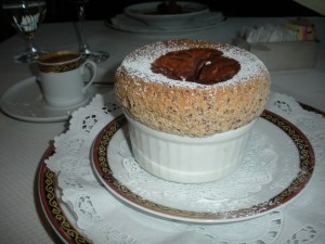 I wisely decided to take half my salmon home to save room for the grand dessert: chocolate chip soufflé. I added a single espresso to complement the meal.