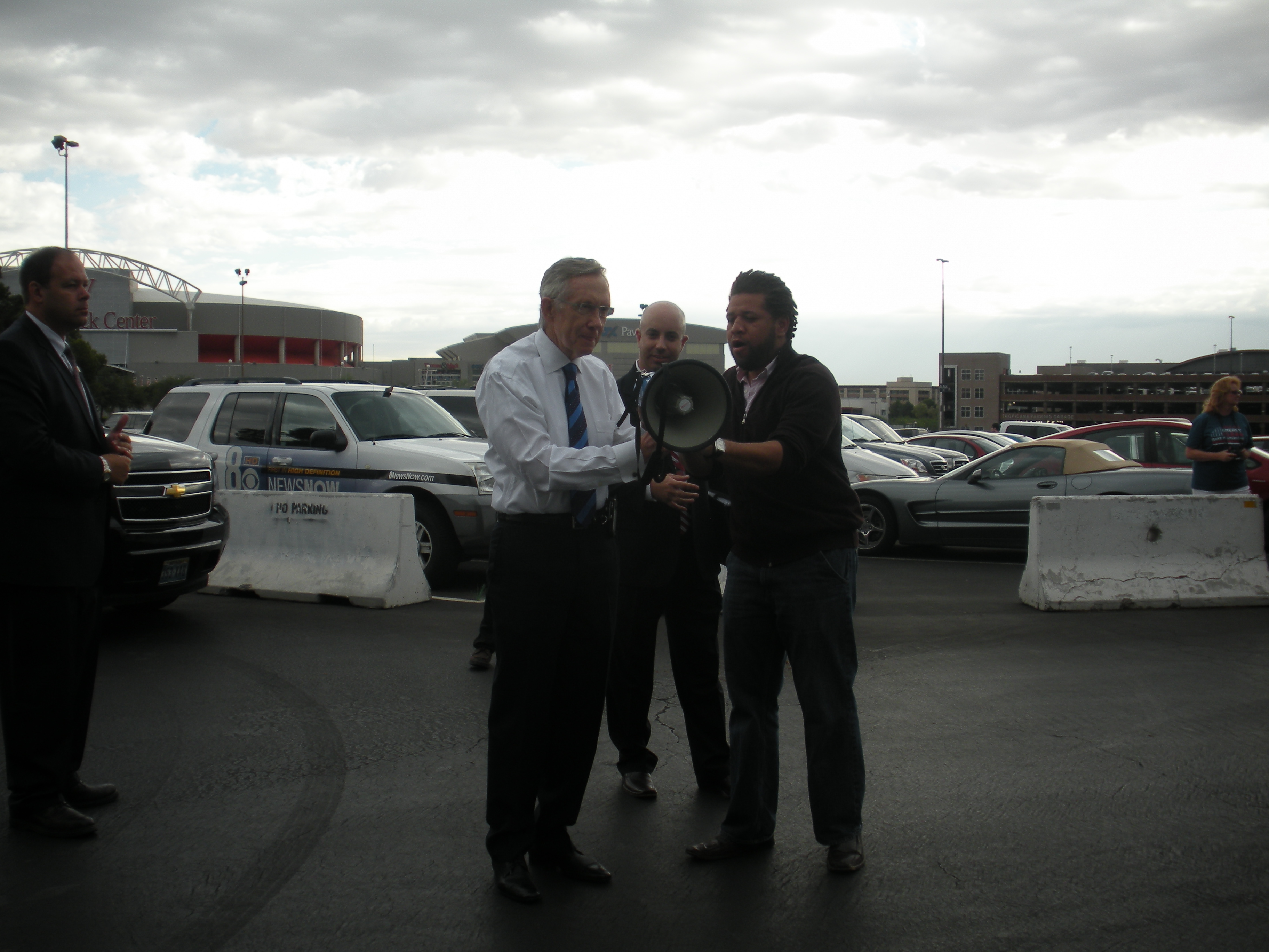 At the end of the rally, Senate Majority Leader Harry Reid dropped by to share his support on his way to the larger summit. Reid said that Nevada already has two large industries – tourism and mining – but he believed that the production and exportation of renewable energy could become the third. Reid faces a challenging Senate re-election race this year, but he received affirmative cheers of “Harry! Harry!” from our group.