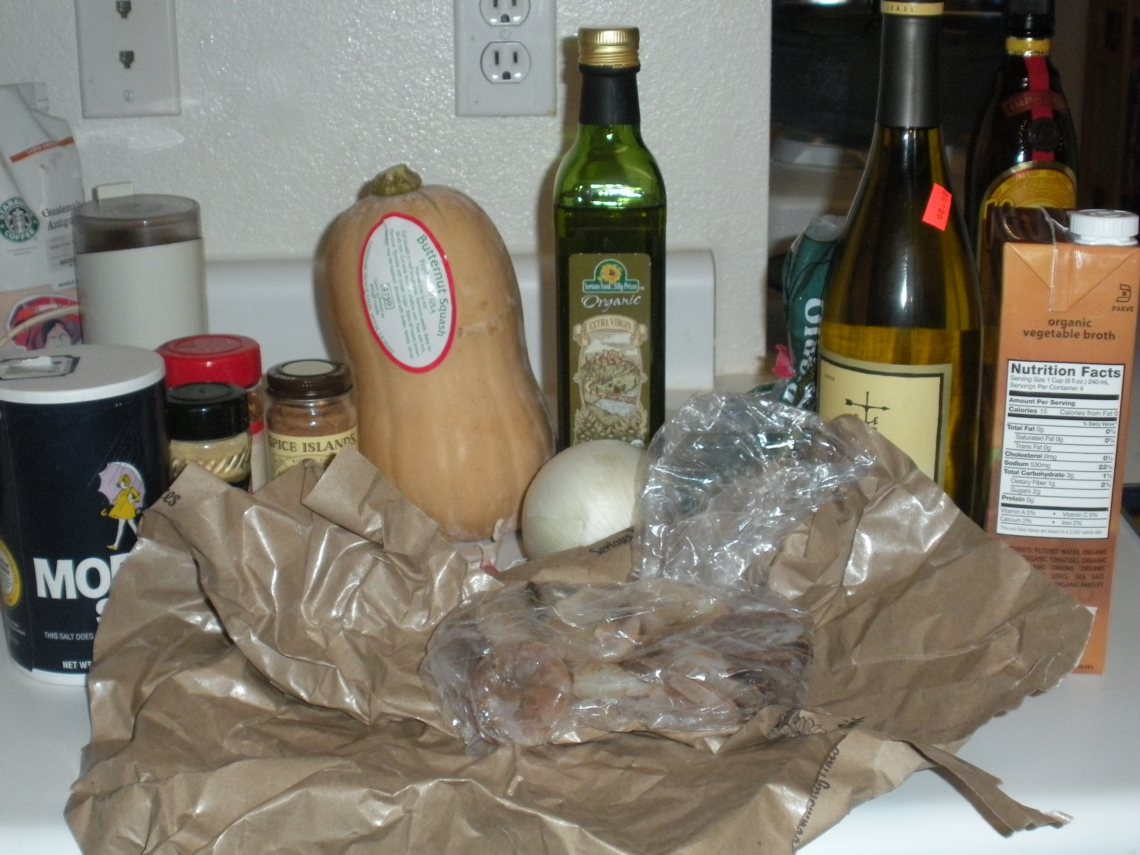 Being a foodie, one of my favorite things about fall is butternut squash. Last year around this time I made an excellent vegan recipe for Apple-Pumpkin Risotto with Carmelized Onions, taken from Isa Chandra Moskowitz’s ‘Nickel and Dined’ column in BUST magazine. While I enjoyed it, my husband asked, “where’s the meat?” I came up with this dish as a compromise, which combines some of my favorite fall flavors.