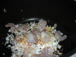 In a large saucepan, combine the olive oil, shrimp, garlic, onion and red pepper flakes. Sauté over medium heat for about 7 minutes, stirring frequently.
