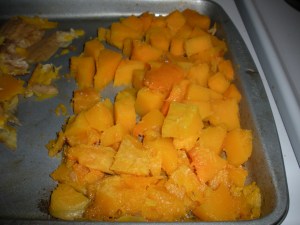 Lightly coat a cookie sheet with olive oil and place the squash face down. Bake for 35 minutes or until squash is soft when you pierce it with a fork. After it’s cooked, place aside and let cool. Then, peel the skin off the squash and cut into bite size pieces.