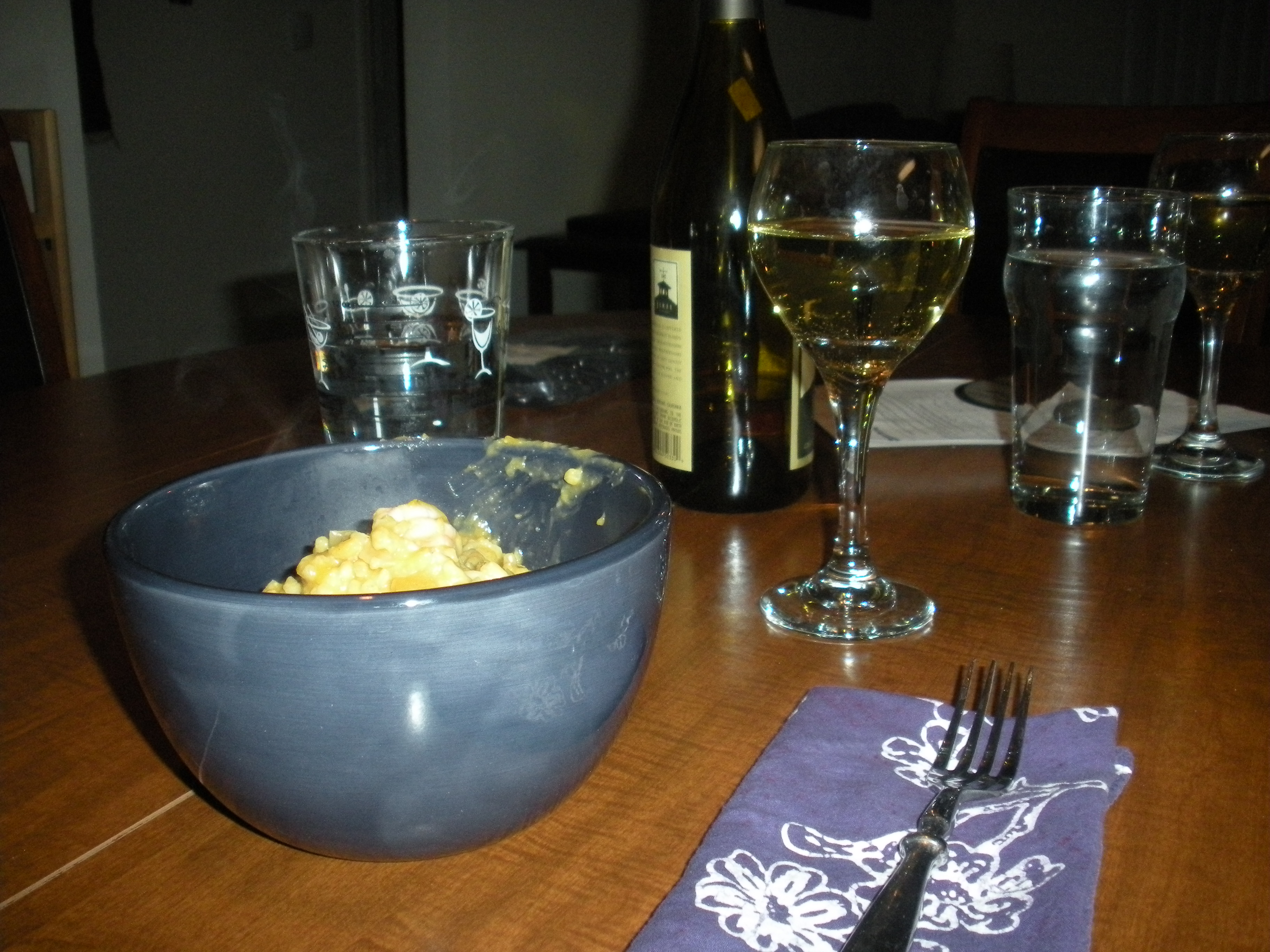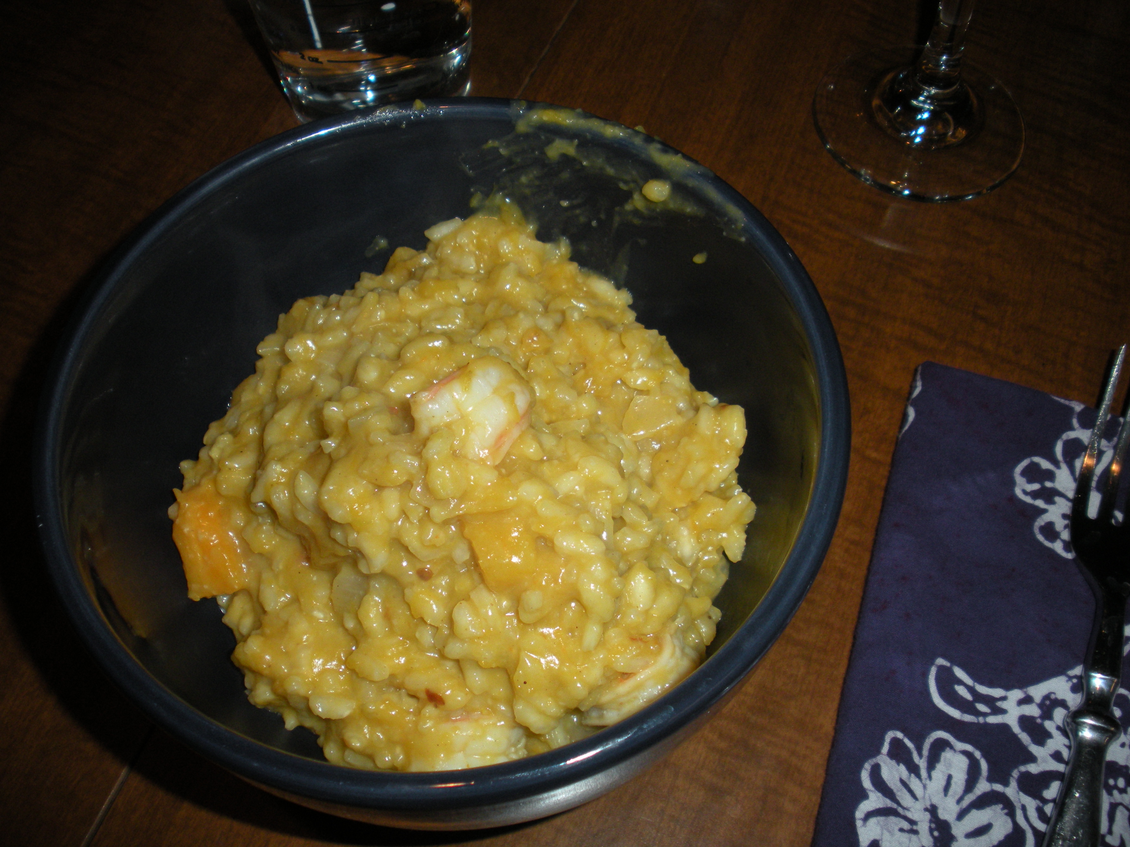 For ingredients, you’ll need 1/2 of a whole butternut squash (about 2 pounds), 1 pound uncooked shrimp, 2 tablespoons of olive oil, 1 small onion finely chopped(white or yellow), about half a head of garlic, 1 teaspoon red pepper flakes, 1 1/2 cups of Arborio rice, 1 bottle medium-grade dry white wine (don’t worry – not all of the wine will end up in the risotto!), 5 cups of vegetable broth, 1/3 cup of parmesan cheese, 1/2 teaspoon salt, 1/2 teaspoon ground ginger, and 1/2 teaspoon ground nutmeg.