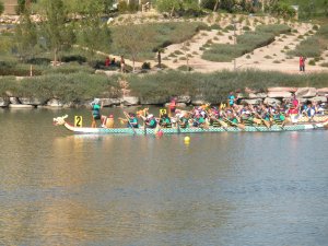 Today was the 2nd Annual Rose Regatta Dragon Boat Festival at Lake Las Vegas to benefit breast cancer services for uninsured women and men at St. Rose Dominican Hospitals. Sixty teams competed this year. While many were from right here in Southern Nevada, there were a fair number of club teams from throughout North America — California, Colorado, Oregon, Washingon, Pennsylvania, British Columbia and Ontario. Nine teams were comprised of breast cancer survivors. Many teams had creative names, such as Save the Bobbies, Dragon Slayers and Abreast in a Boat.