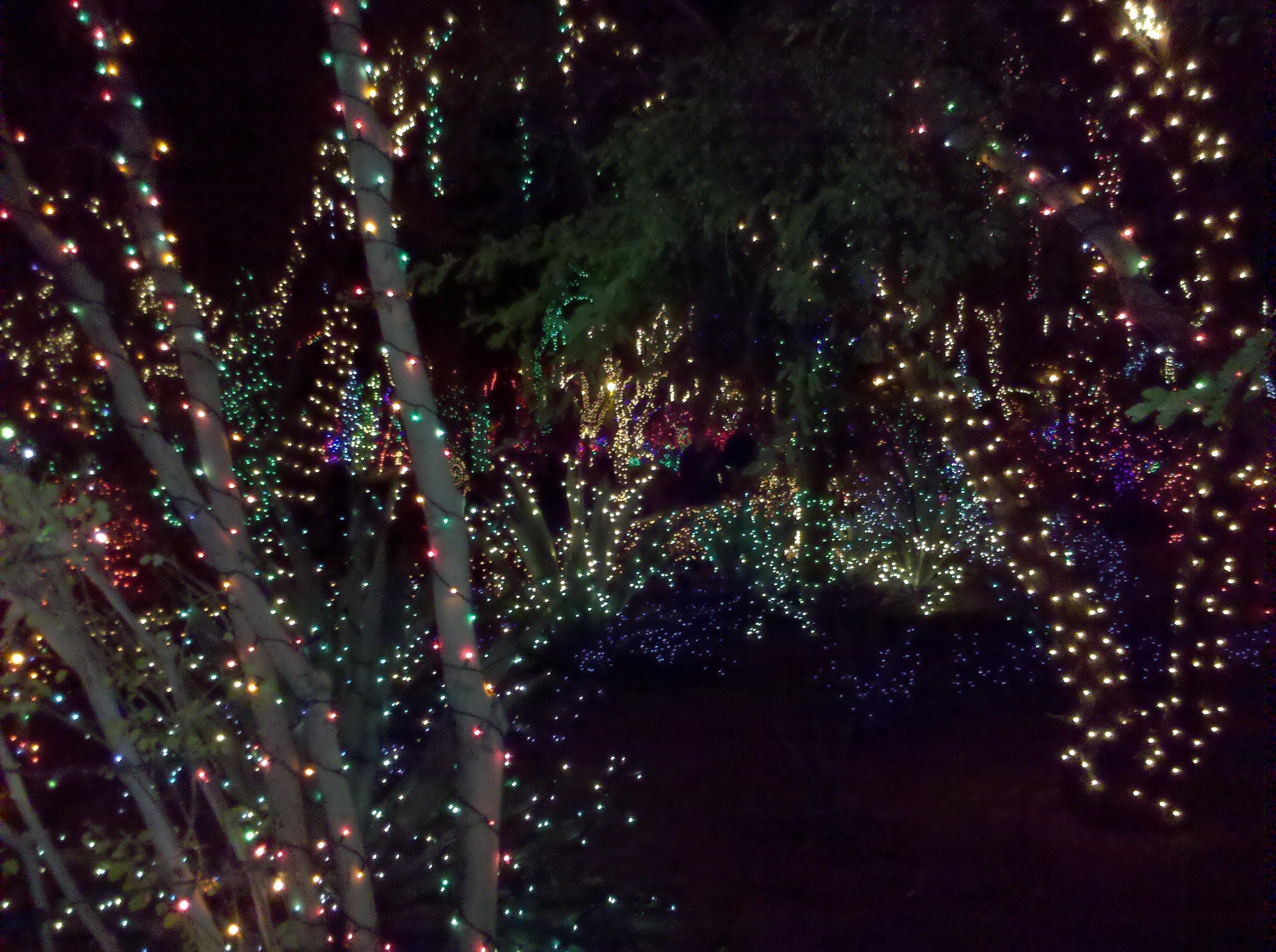 But now back to the best part of the Christmas lights in the botanical garden — admission is free. For us poor folk, this is a way better deal than the $9.75 general admission for the Magical Forest at Opportunity Village (although that is for a good cause!) and the $15 per car at the Las Vegas Motor Speedway’s Gift of Lights (which appears to be for-profit!). However, the Mars family is billionnaires and they did seem to be making a bundle on their chocolate sales…so I guess they can afford the free lights show.
