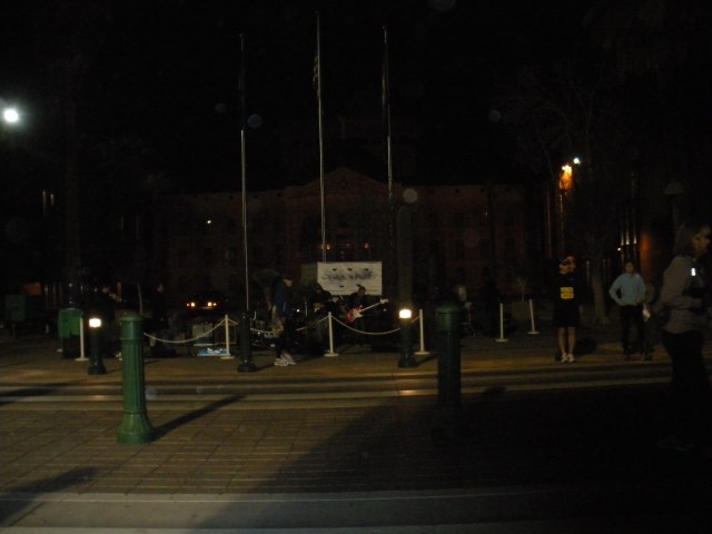 Marathon morning, we were up at 4 am (3 am by Las Vegas time) to catch the bus to downtown Phoenix. We were there by 6 – about 4 hours before I started running – but fortunately we at least had a band to listen to while we froze in the dark. These guys were troopers.