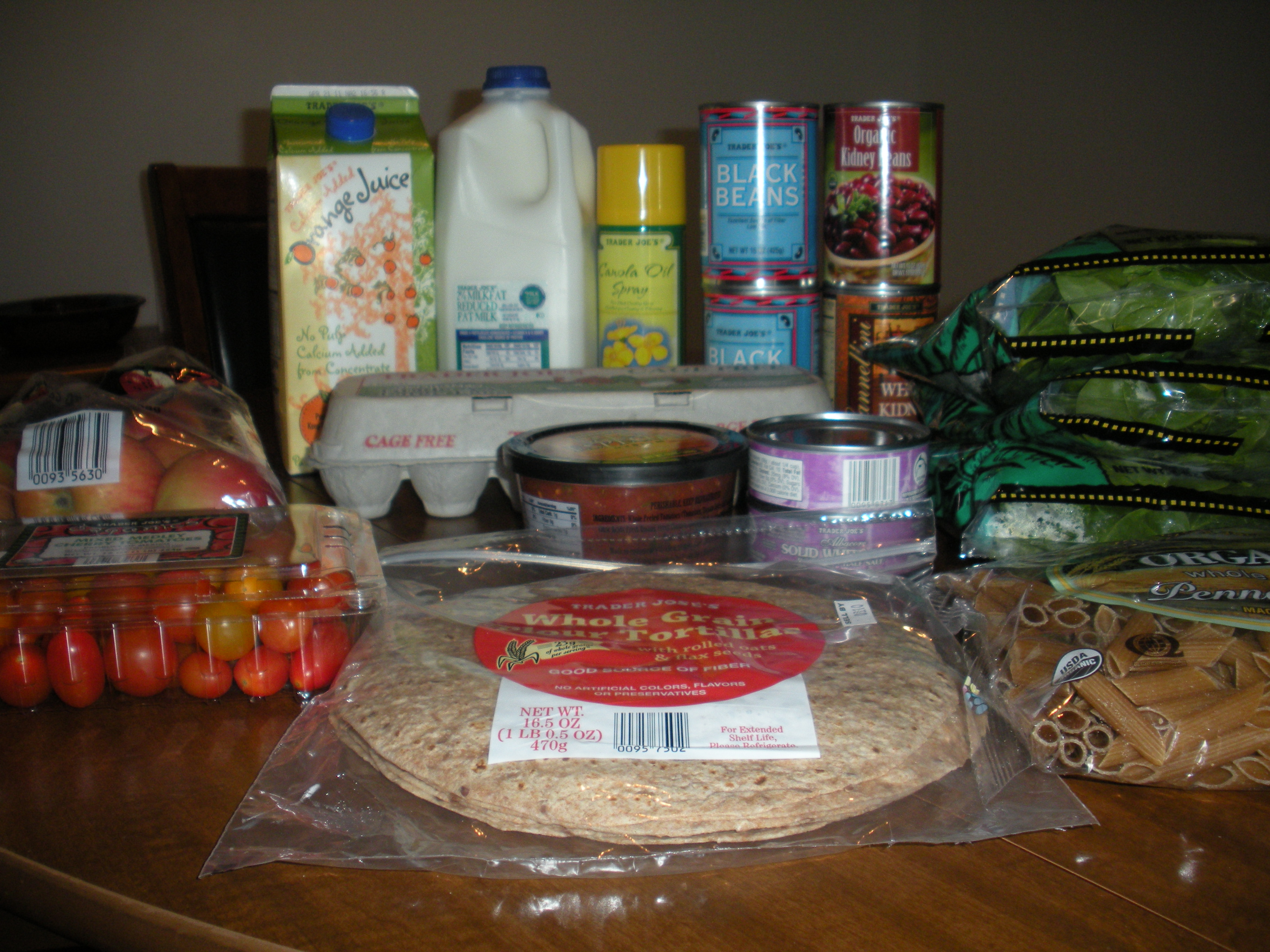 To add to the challenge, I (a) wanted to eat as healthy as possible and (b) wanted to find meals that are relatively quick to prepare, as I have a busy work schedule during the next week. I decided to do my grocery shopping at Trader Joe’s (my favorite grocery store!), because that’s where I’ve generally had the best luck finding healthy products at a low cost. So here’s what I got: