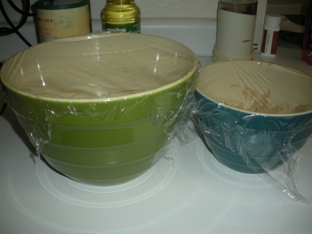 After kneading the dough for 15 minutes, I left it covered on the counter to rise for another 2 hours. Then I divided the dough in half, shaped them into bread pans, and let them rise another 2 hours while I left to do karate.