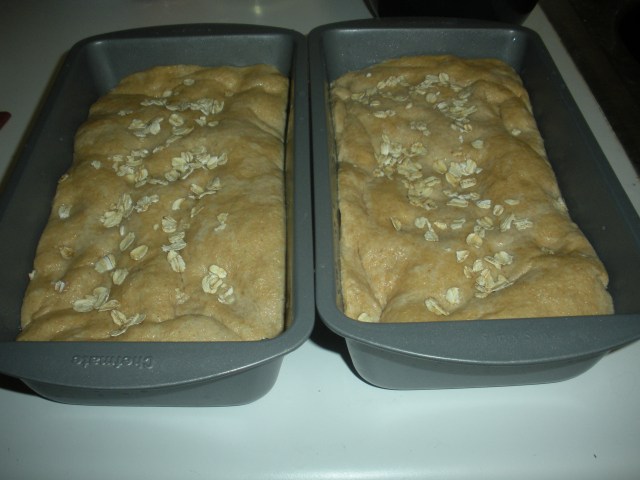 When I came home they had more-than doubled in size. While I preheated the oven, I sprinkled water and rolled oats on top of the loaves to make them a bit prettier.