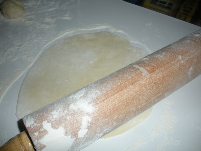 In a medium-size bowl, combine the flour, salt and baking powder. Add the butter and mix until the dough has a mealy texture. Add 1/2 cup of the warm water and mix until all of the dry ingredients are absorbed. You may need to add 1/4 or 1/2 cup of additional water to absorb the dry ingredients. Set the dough aside for 15 minutes.