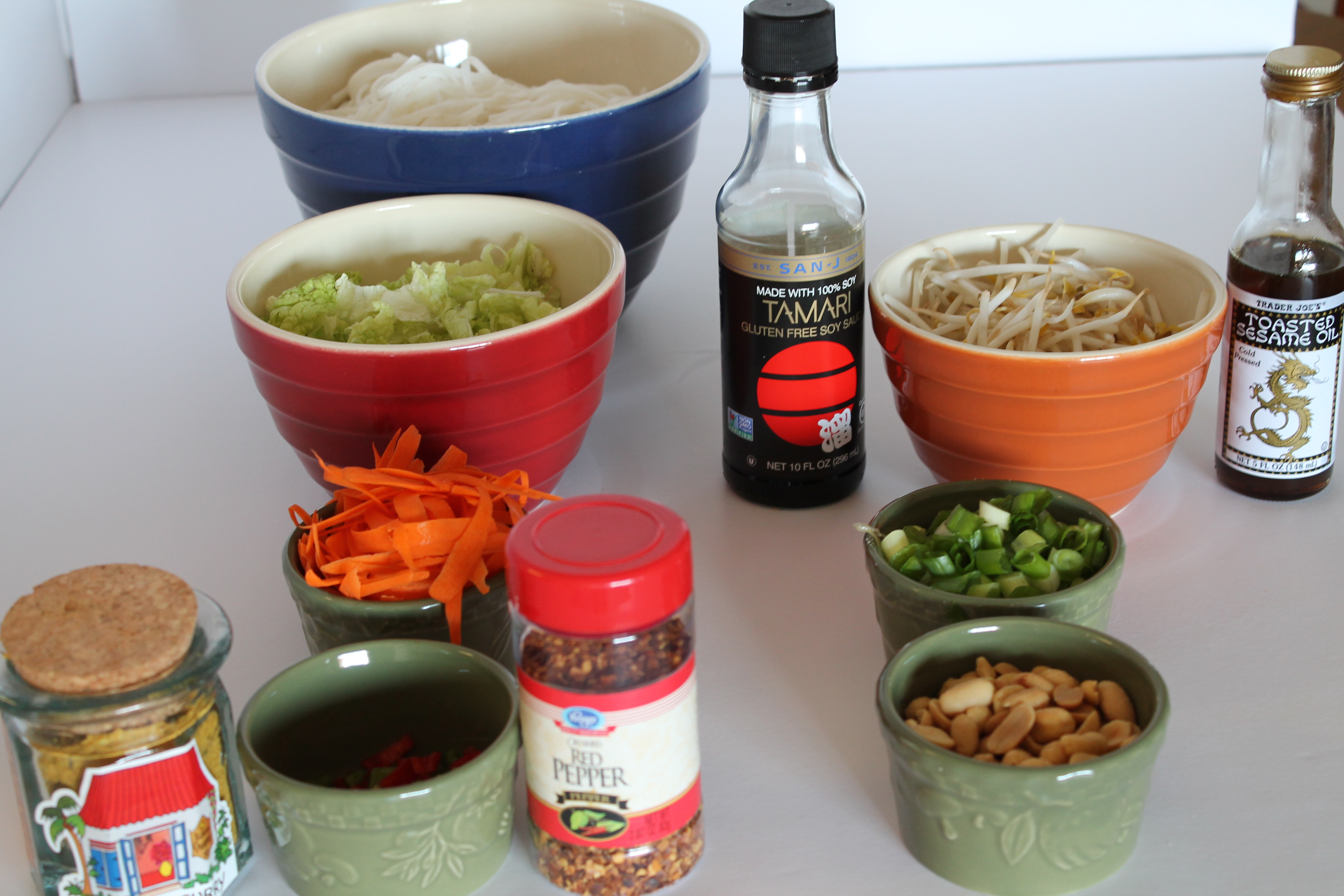 The key to a good stir-fry dish (as I learned in a recent cooking class) is to know which order to add the ingredients and how long to cook each. To organize things, I like to place each set of ingredients in a row according to the order they should be added. For this dish, the order is: (1) jalapenos; (2) cabbage, carrots, curry powder and red pepper flakes; (3) vermicelli noodles, soy sauce and sesame oil; and (4) peanuts, bean sprouts and green onions.