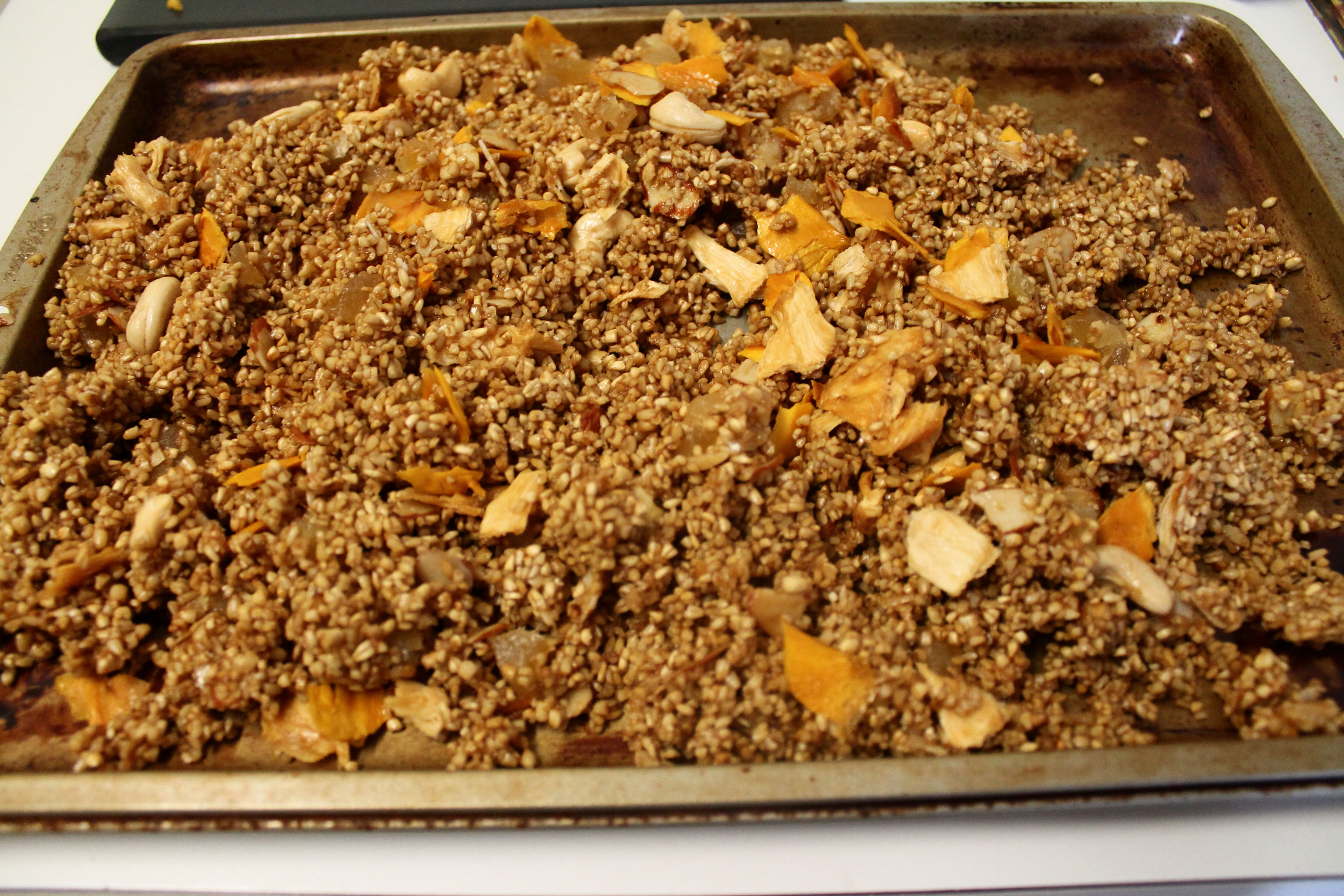 I’m actually quite pleased with how well the recipe turned out, because it originated from an idea that just popped into my head. This granola combines ingredients such as vanilla extract, organic coconut palm sugar, spiced rum, shredded coconut, cashews and almonds, dried mango and pineapple and candied ginger. It’s versatile enough to be eaten as a breakfast cereal, yogurt topping or trail mix. My husband and I have been snacking on it ever since it came off the stovetop.