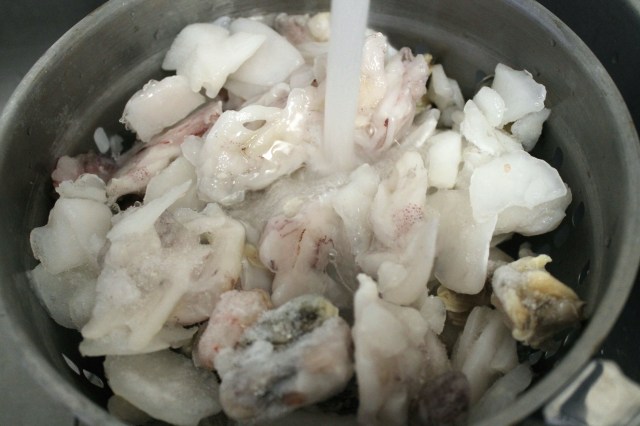 2. If your seafood is frozen (which mine was since I live in the desert), place in a colander and run under cool water for about 5 minutes to thaw. As you won’t need to add to to the stew for a while, return to the refrigerator, preferably placing a dinner plate under the colander so you don’t get stinky fish juice all over your fridge.