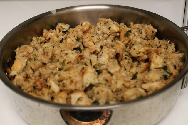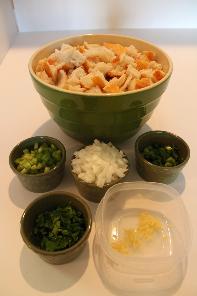 4. In the meantime, do the prep work for the stuffing. Cube the bread, being careful not to eat too much of it in the process (I ate about 15% of the bread and still had enough for the stuffing). Cover bread with 1/2 – 1 cup cool water to moisten and set aside. Dice the larger onion, 2 celery ribs, 2 green onions, the parsley and mince 4 cloves of garlic.