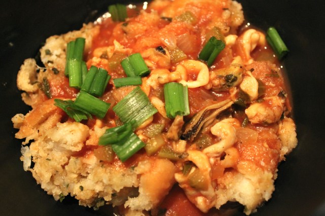 7. To serve, place about 1 cup of stuffing in a soup bowl. Top with 1 cup of cioppino and garnish with a few chopped green onions.