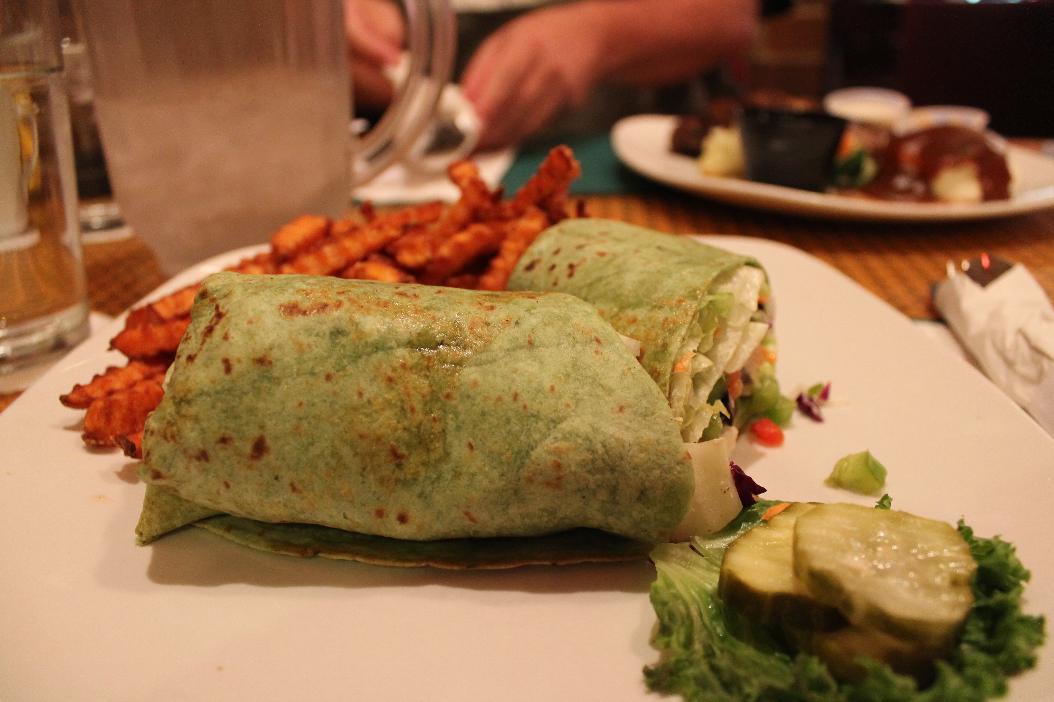 This vegetarian mediterranean wrap with sweet potato fries satisfied my taste buds while the husband dined on prime rib.