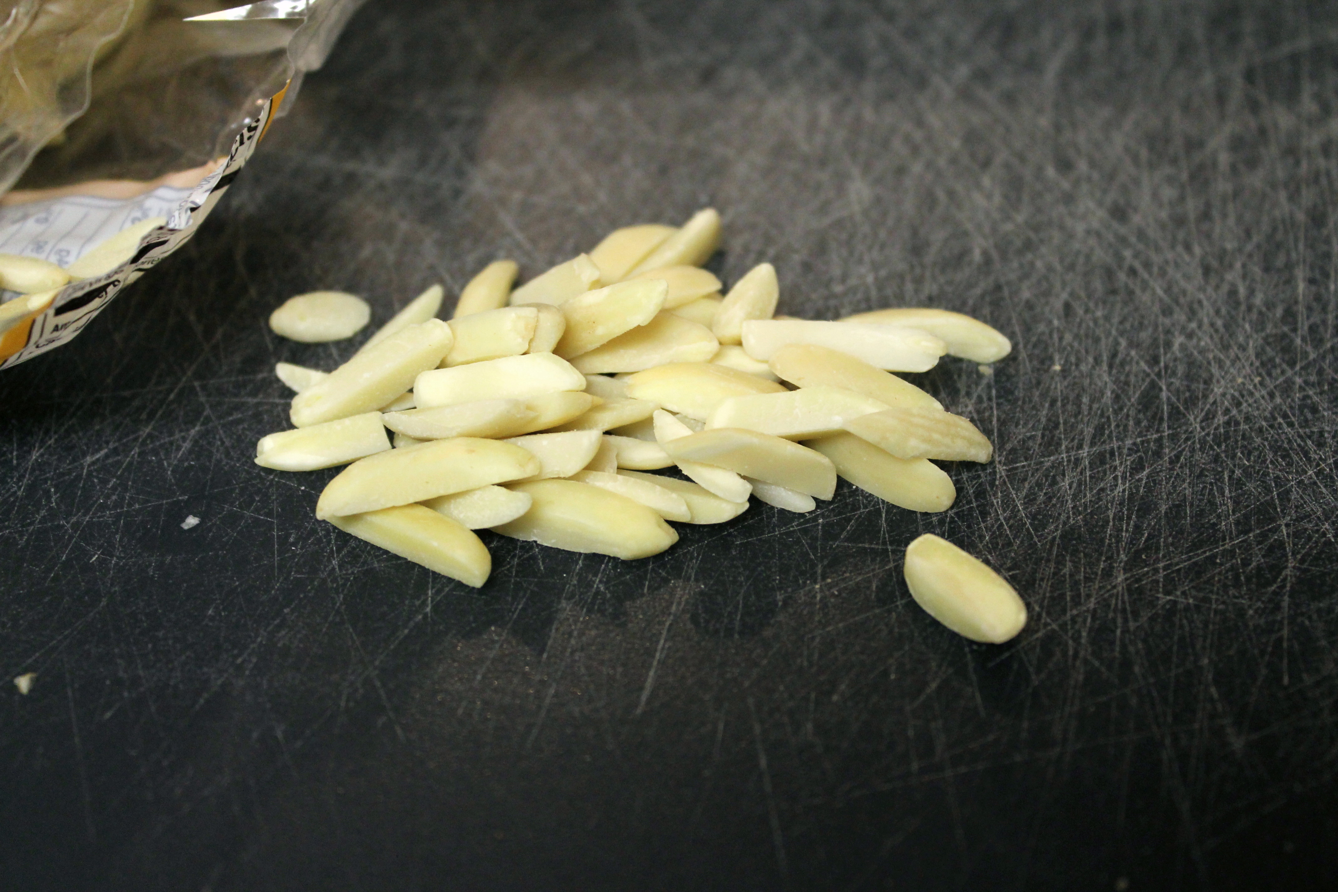 Next, add 2 tablespoons of slivered almonds. Here, I’ve used raw, blanched almonds that I bought at Trader Joe’s.