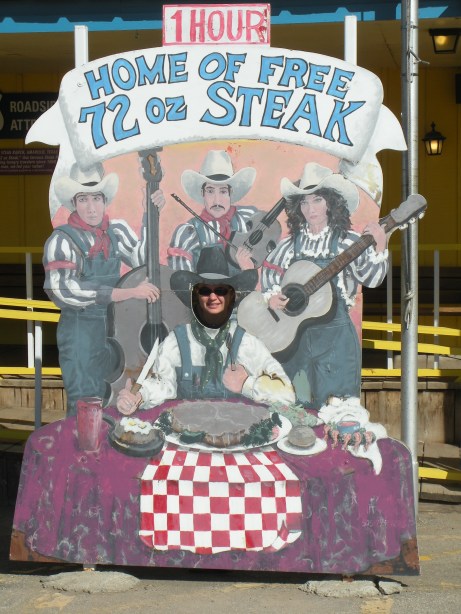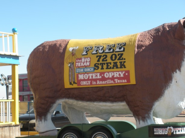 Driving along the I-40 for hundreds of miles, we kept seeing signs for “Free 72 oz. steak” in Amarillo, Texas. While neither of us was particulary interested in attempting this feat, we did have to stop at the “World Famous” Big Texan Steak Ranch for a photo shoot.